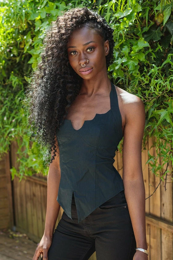 This gorgeous bat inspired halter neck blouse features bat wing detailing, pointed front and fabric neck ties.