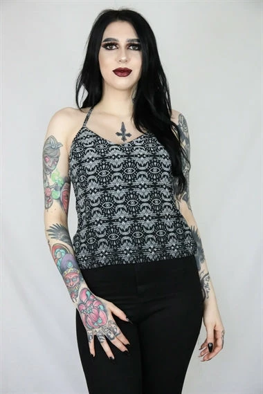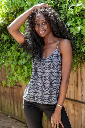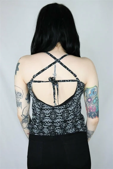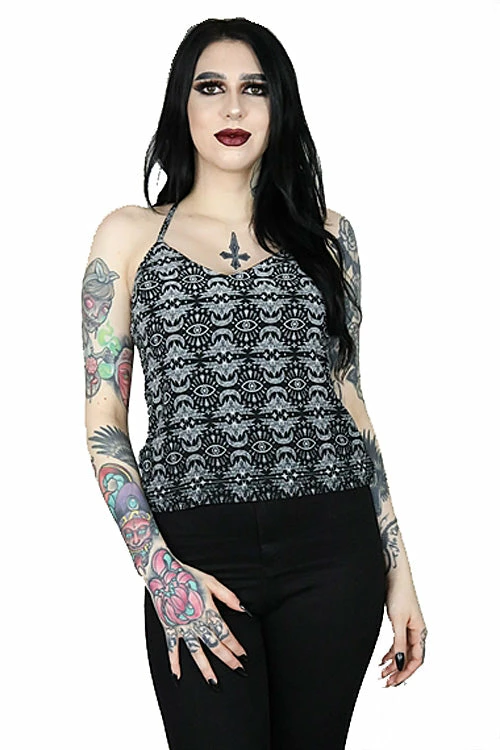 This print camisole features a white bats, moons and all-seeing eye design all over, delicate straps begin at the V-neckline and cross over the back. Team with the Batwing Skirt Midi Skirt to complete the look.